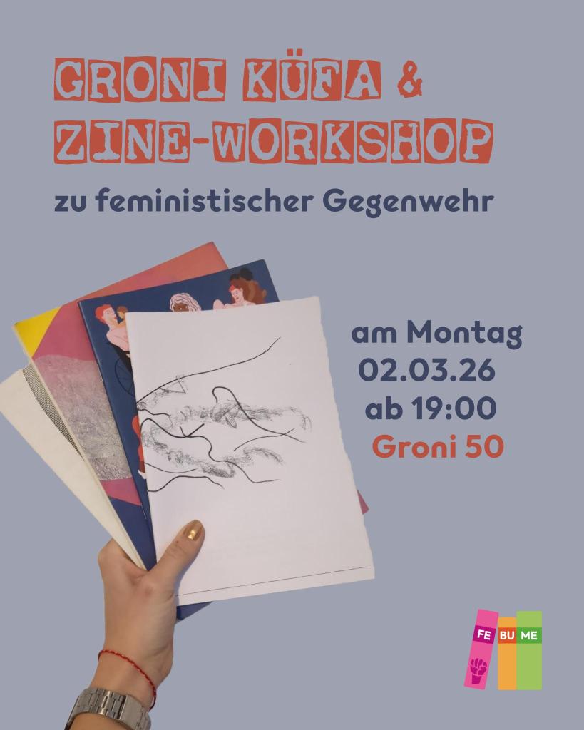 Sharing is caring! The Feminist Book Fair Berlin invites you to the next Küfa at Groni for a zine workshop and book flea market.