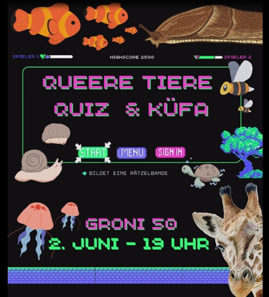 Es wird spicy in der Groni: Es gibt wieder Soli-Küfa und ein Pubquiz-Special in der Groni50. Delfine, Bonobos, Schnecken, Clownfische und co. – die Tierwelt ist queer und zeigt uns, dass es ganz natürlich ist, von Normen abzuweichen. Wir haben euch ein Pubquiz mit witzigen, spannenden und interessanten Fakten zusammengebastelt und freuen uns, mit euch zu knobeln. Bringt eure Friends mit und bildet eine nette Rätselbande. Es warten natürlich Gewinne, Gewinne, Gewinne! Und wer im Tierkostüm kommt, ist Sieger*in der Herzen!